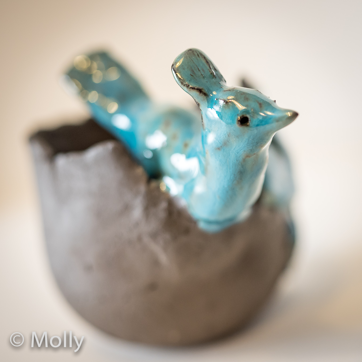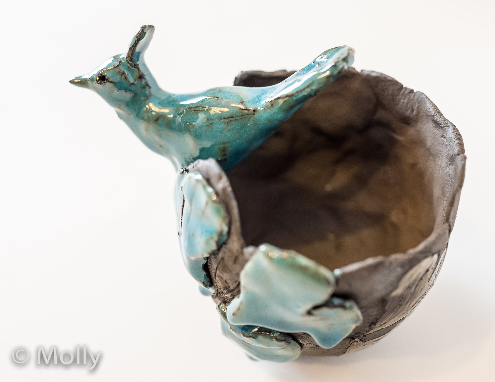 En observant les mésanges dans mon jardin en 2018, je suis tombée sous le charme de ce petit oiseau aux couleurs si belles. Tous les matins j’observais le va et vient des parents qui apportaient à manger à leurs petits à tour de rôle. Je me souviendrai toujours de ces petites têtes affamées qui sortaient par le trou du nid le bec grand ouvert. J’ai décidé de figer ce moment en réalisant ce bol en céramique aux couleurs bleue/vert .
